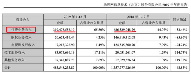 根据乐视网年报数据,2019年乐视网付费业务收入为3.19亿元,而2018年的收入为6.87亿元,前者不足后者的一半。