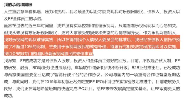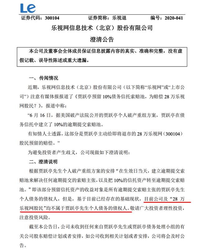 同时,乐视网披露尚未收到任何来自贾跃亭或贾跃亭债务处理小组的有关公司股东的赔偿计划。