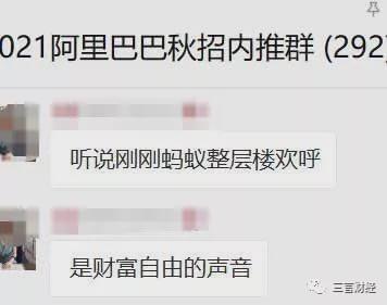 一张阿里巴巴秋招内推群的聊天截图显示,“听说刚刚蚂蚁整层楼欢呼,是财富自由的声音。”