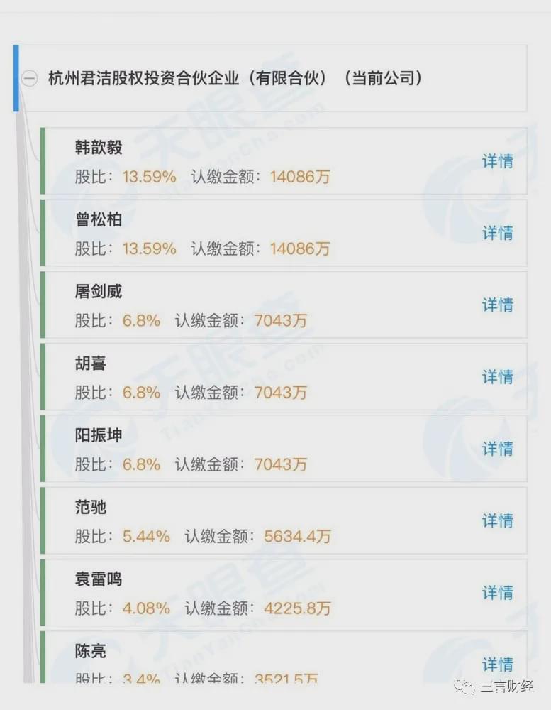 杭州君洁股东中,曾松柏和韩歆毅持股最多,均为13.59%。