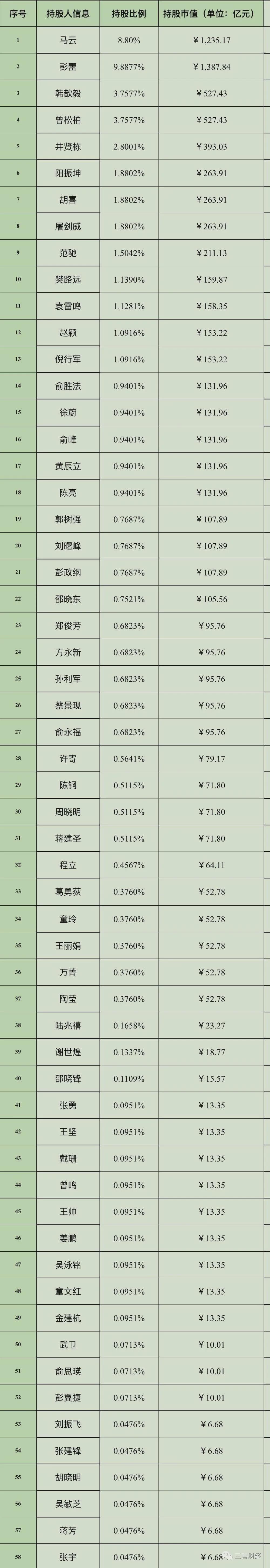 统计数据显示,蚂蚁和阿里系高管58位亿万富翁中,过100亿的有22人,过50亿的有37人,最少身家也达到了6.68亿元。