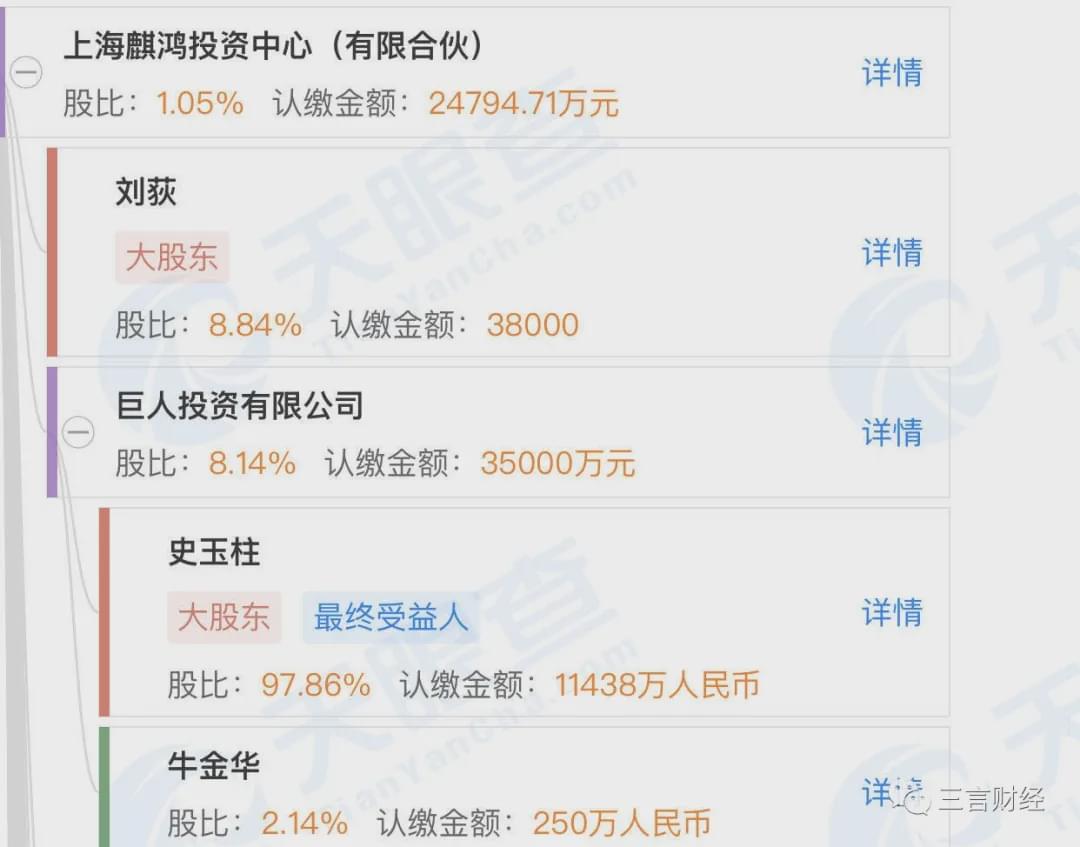 蚂蚁集团另外一家股东上海麒鸿投资中心有限公司中,也能看到史玉柱的身影。