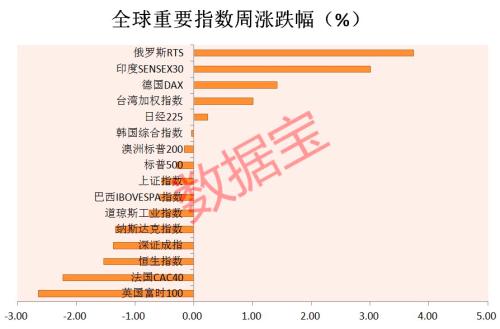 从近一周全球重要指数表现看,俄罗斯RTS涨幅最大,周累计涨3.74%,印度SENSEX30指数周K线6连阳,涨3.01%,英国富时100和法国CAC40指数表现最差,分别下跌2.65%、2.23%。