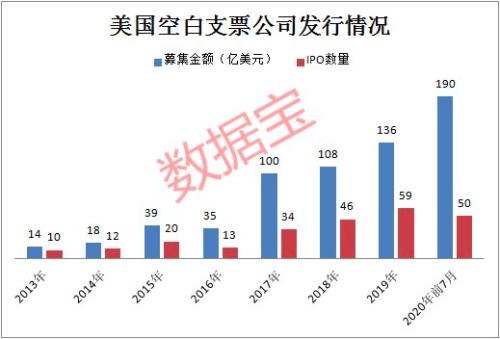 截至7月24日,数据显示,今年以来已有50家空白支票公司IPO,合计募集金额达到190亿美元,创下历年最高纪录,2015-2019年的年度募集金额分别为39亿美元、35亿美元、100亿美元、108亿美元和136亿美元。