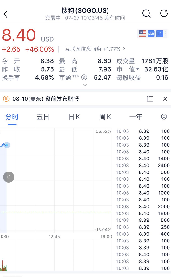 消息出来之后,搜狗的股价飙涨了46%,市值增加了10亿美元(相当于70亿人民币),截至发稿,搜狗美股市值超32亿美元,比母公司搜狐的市值还高出不少。