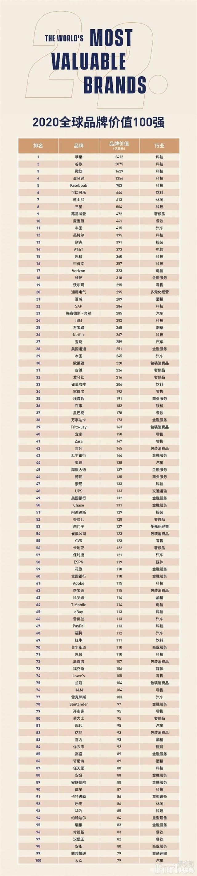 炣燃科技7月29日(方锐综合)日前,福布斯2020年全球品牌价值100强名单出炉。据悉,上榜的100个品牌,总价值高达2.54万亿美元。