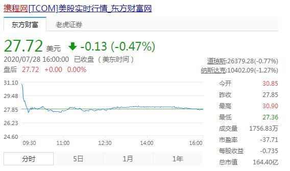 截止美东时间7月28日收盘,携程网报收27.72美元,总市值为164.40美元。