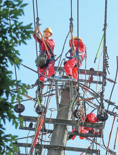 七月二十八日,国家电网四川省华蓥供电公司的抢险突击队员冒着摄氏三十八度的高温,在该市红星四路口及时抢修由于负荷过重而损坏的供电设备。 邱海鹰摄(人民视觉)