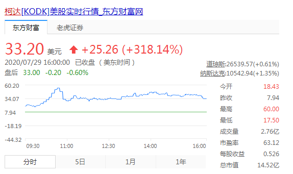 美东时间7月29日收盘,柯达股价至25.26美元,涨幅达318.14%,报收33.20美元/股,换手率高达618.06%,总市值为14.5亿美元,较前一交易日多了11亿美元。