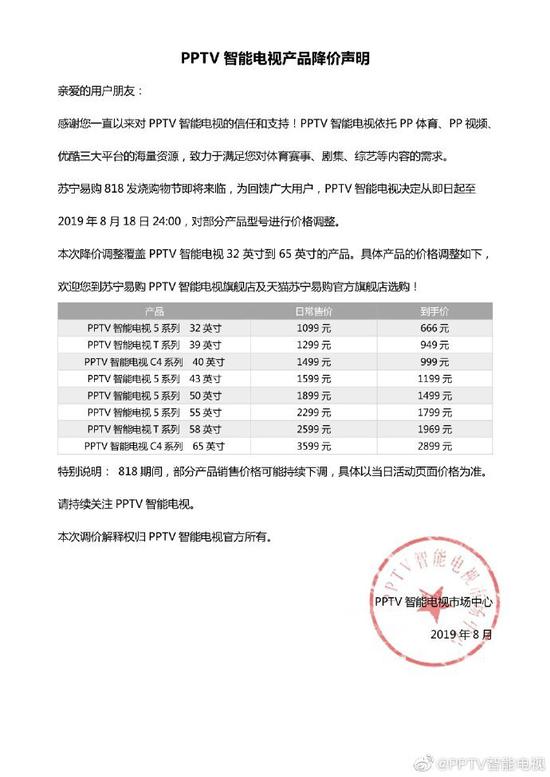 中国网科技8月6日讯 继康佳、小米等品牌下调小尺寸电视价格之后,5日,互联网电视品牌PPTV在官方微博也发布降价声明,从8月5日至18日,对部分型号产品进行价格调整。据悉,此次调整涉及到PPTV电视32寸至65寸产品,降价幅度在400至1000元不等。其中,32寸电视降至666元、40寸电视降至999元引起业内关注。