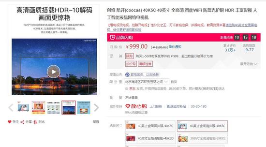 酷开40寸智能电视同样降至999元