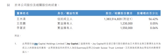 新浪港股查询发现,Joy Capital HoldingsLimited为公司实控人兼董事局主席王木青的家族信托。