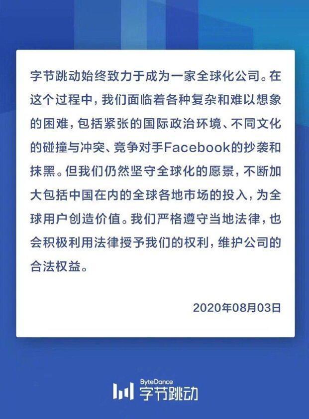 声明说:字节跳动始终致力于成为一家全球化公司。在这个过程中,我们面临着各种复杂和难以想象的困难,包括紧张的国际政治环境、不同文化的碰撞与冲突、竞争对手Facebook的抄袭和抹黑。但我们仍然坚守全球化的愿景,不断加大包括中国在内的全球各地市场的投入,为全球用户创造价值。我们严格遵守当地法律,也会积极利用法律授予我们的权利,维护公司的合法权益。
