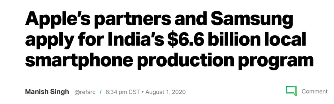 8月1日,印度电子和信息技术部长Ravi Shankar Prasad在推特上表示,三星电子、富士康等苹果的合作伙伴们入选一项智能手机生产激励计划,此举可能在未来五年内将手机行业产值提高到11.5万亿卢比(约1500亿美元)。