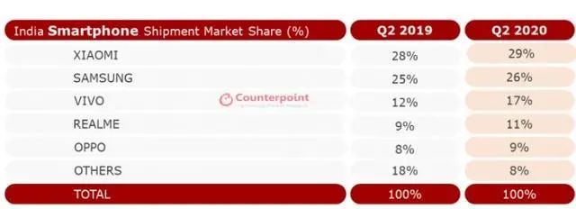 据调研机构Counterpoint数据显示,今年印度市场第二季度手机出货量中,中国国产手机品牌小米、vivo、OPPO和Realme的市场份额分别为29%、17%、11%和9%,占据了销量前五中的四席。