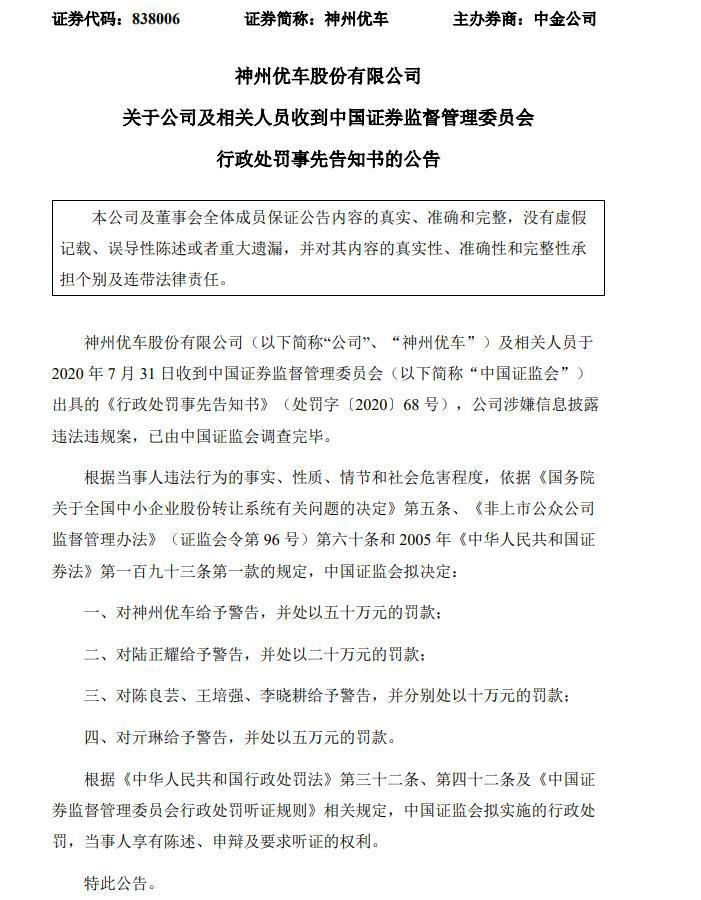 网易财经综合报道神州优车(838006)公告称,公司及相关人员于2020年7月31日收到中国证监会出具的《行政处罚事先告知书》,公司涉嫌信息披露违法违规案,已由中国证监会调查完毕。中国证监会拟决定:对神州优车给予警告,并处以五十万元的罚款;对陆正耀给予警告,并处以二十万元的罚款。