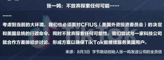 今天中午,字节跳动创始人张一鸣发送公司全员信,回应了外部关于tiktok美国业务的传言和猜测,信中表示:不放弃探索任何可能,下一步的解决方案会考虑用户、团队,公司三个因素,做值得信任的全球公司。