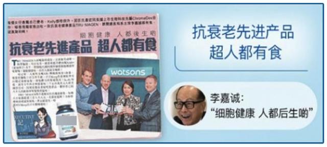 “长寿药”、“长生药”,再然后就升级为秦始皇都想要的“不死药”了,一通吹嘘,神乎其神,说是类似的产品潘石屹曾经吃过,而李嘉诚也投资过一家类似的公司,保不齐李超人也吃这个“仙丹”续命呢。
