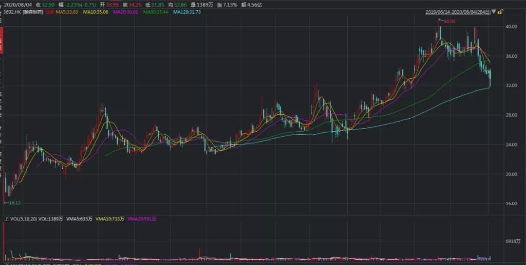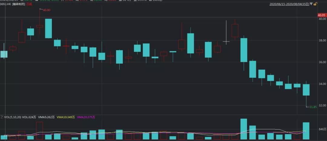 以钟慧娟为例,翰森制药自6月下旬创下40.90港元/股的高价后,其股价已经延续近一个月的阴跌,截至8月4日港股收盘报32.9港元/股。