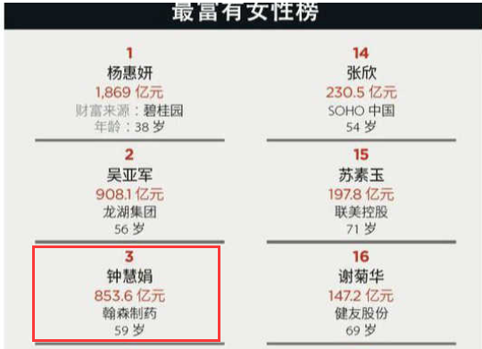 榜单显示,翰森制药董事会主席钟慧娟以195亿美元(约合人民币1361.5亿元)的身家位列榜首。
