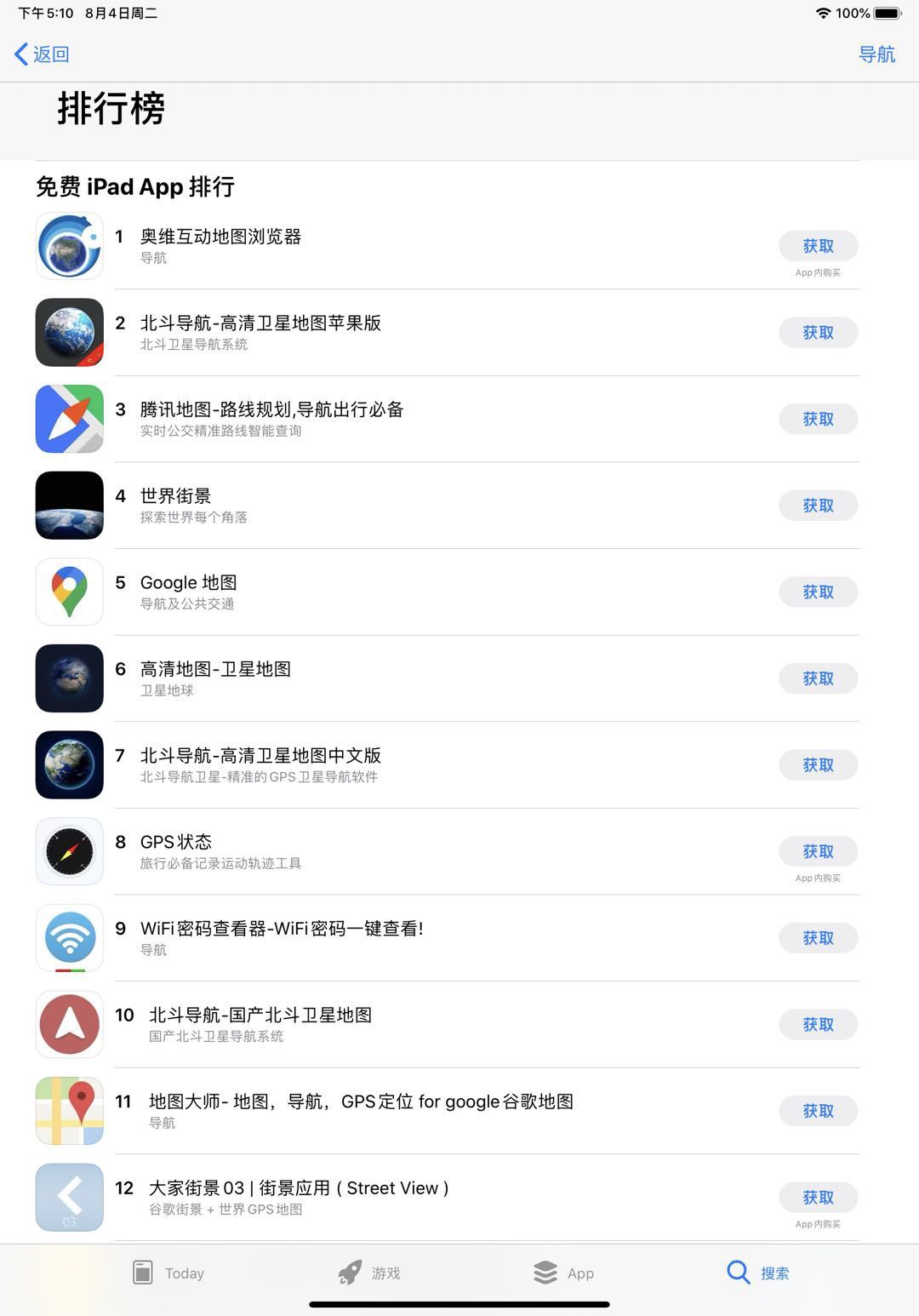 在苹果应用商城以“北斗”为关键词搜索,记者发现有七八款App都被冠以“北斗”之名,其中下载量最高的有12万之多,便是“北斗导航-高清卫星地图苹果版”,截至8月4日17时,这一App在地图类免费iPad App上排名第二,高过腾讯地图、Google地图。另有名为“北斗导航-高清卫星地图中文版”位居第7,“北斗导航-国产北斗卫星地图”位居第10。