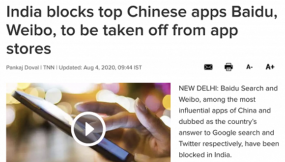据《印度时报》4日报道,印度政府已要求该地区的谷歌和苹果应用商店下架百度搜索和新浪微博。