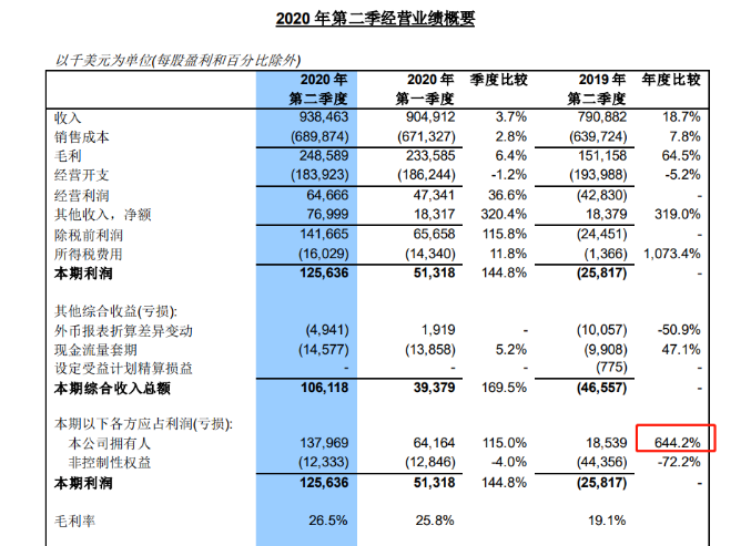 第二季度,归属于公司所有人的应占利润为1.38亿美元,同比增长644%。