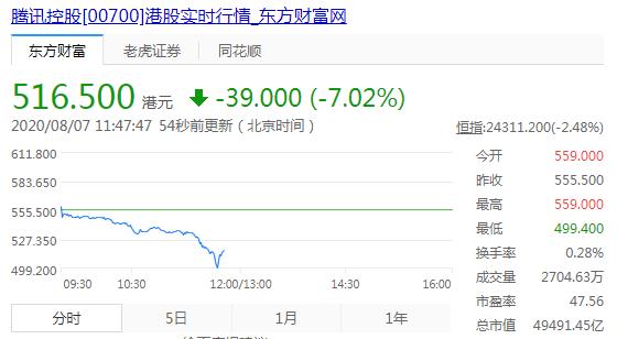 跌幅最大的是腾讯。盘中跌幅一度超过7.02%。市值也随即跌破了5万亿大关。