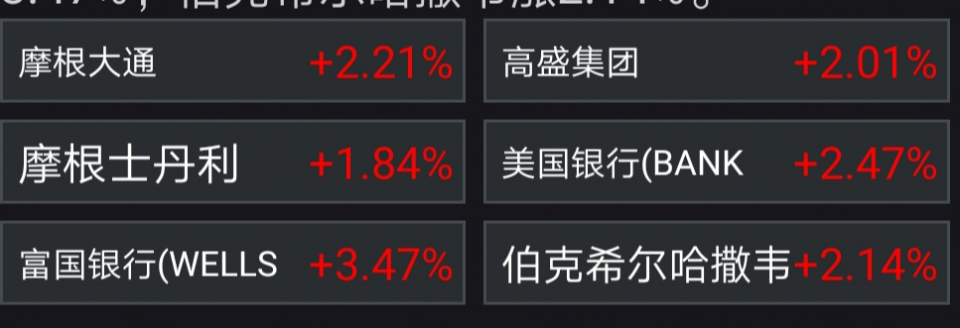 周五美国三大股指涨跌不一,道指与标普500指数均录得六连涨,纳指终结七连涨。道指收涨0.17%,纳指跌0.87%,标普500指数涨0.06%。美国金融股集体上涨,摩根大通涨2.21%,高盛涨2.01%,花旗涨2.46%,摩根士丹利涨1.84%,美国银行涨2.47%,富国银行涨3.47%,伯克希尔哈撒韦涨2.14%,纷纷领涨道指。