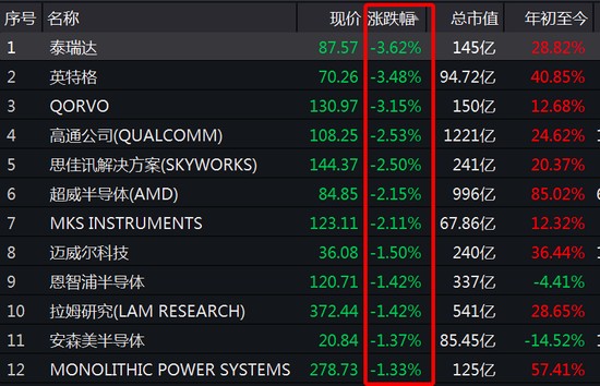 美股主要科技股普跌,由世界上知名半导体企业组成的费城半导体指数跌1.18%,其中QORVO、高通、AMD分别跌3.15%、2.53%、2.15%。