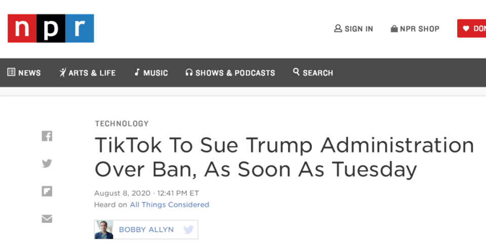 【环球网报道】针对美国总统特朗普签署TikTok和微信禁令,美国国家公共电台(NPR)8日援引知情人士的话透露,TikTok正计划起诉特朗普政府。