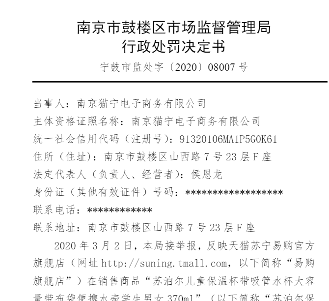 据悉,被处罚的公司为南京猫宁电子商务有限公司。