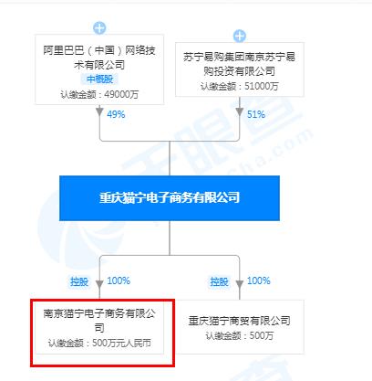 股权结构显示,阿里巴巴持股49%,苏宁易购南京公司持股为51%。