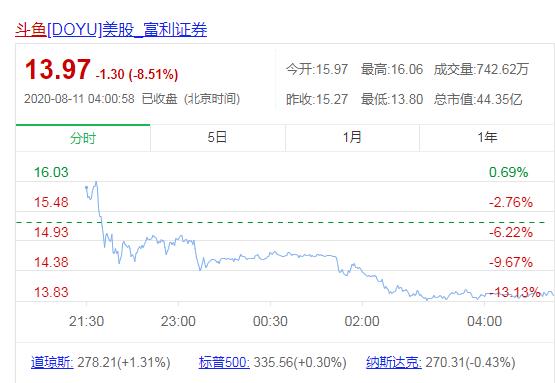 斗鱼也不理想。截止周一收盘,斗鱼股价下跌了8.51%,报13.97美元,总市值44.35亿美元。