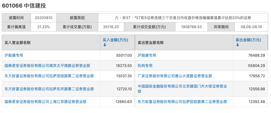 上交所10日披露了中信建投近三个交易日龙虎榜数据,除沪股通和一机构专用账户外,买入席位前五名中,有国泰君安两营业部和东方财富两营业部,其中国泰君安证券股份有限公司南京太平南路证券营业部买入1.83亿元;卖出席位前五名中,广发证券、中金公司、东方财富营业部上榜。