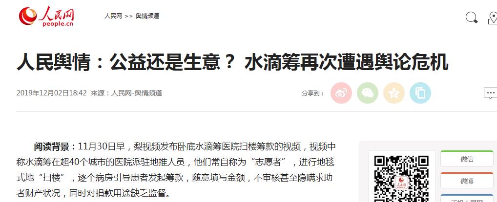 根据人民网舆情数据中心/人民在线开发的“众云大数据平台”的监测结果,自11月30日梨视频发布卧底水滴筹医院扫楼筹款的视频,水滴筹发布官方声明后,舆情开始持续走高,至12月2日,舆情被推至顶峰,相关微博话题阅读量达2.1亿,讨论量1.4万。