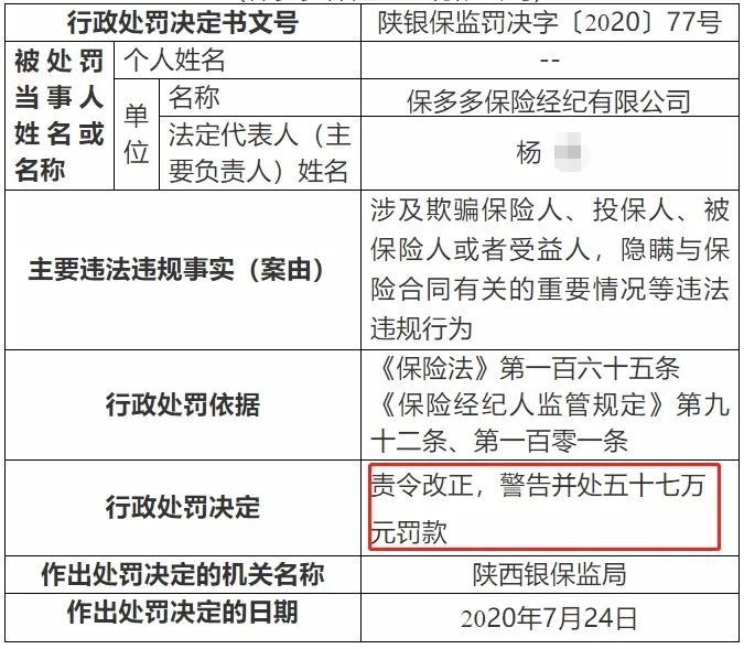 7月24日,陕西省银保监局下发的处罚决定文书显示,保多多保险经纪公司因涉及欺骗保险人、投保人、被保险人或者受益人,隐瞒与保险合同有关的重要情况等违法违规行为,被责令公司改正、警告并处57万罚款,个人被警告和罚款19万,合计罚款76万。