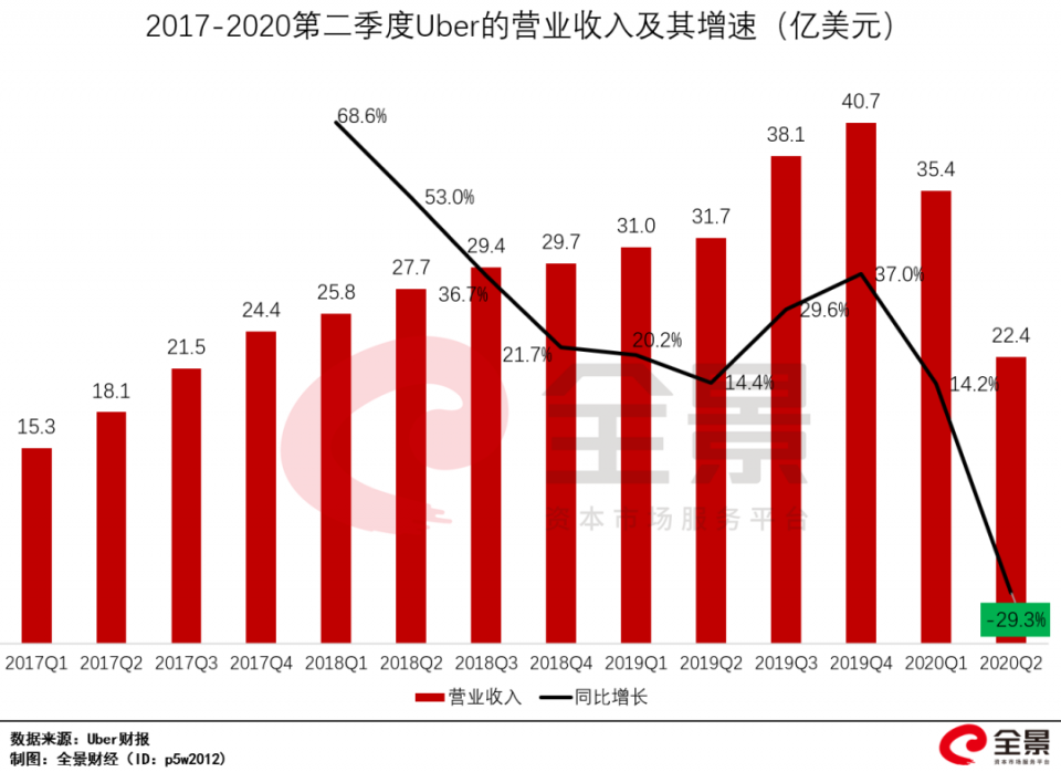 核心业务被重创之后,2020年二季度,Uber的营收规模首次出现下滑,下滑幅度达29%。