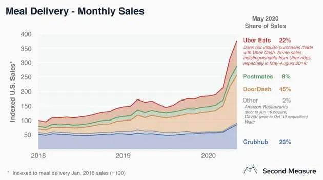 2020年7月初,Uber以26.5亿美元全股票交易方式收购了“美国饿了么”Postmates,一举拿下了美国外卖市场份额的32%,位居首位。