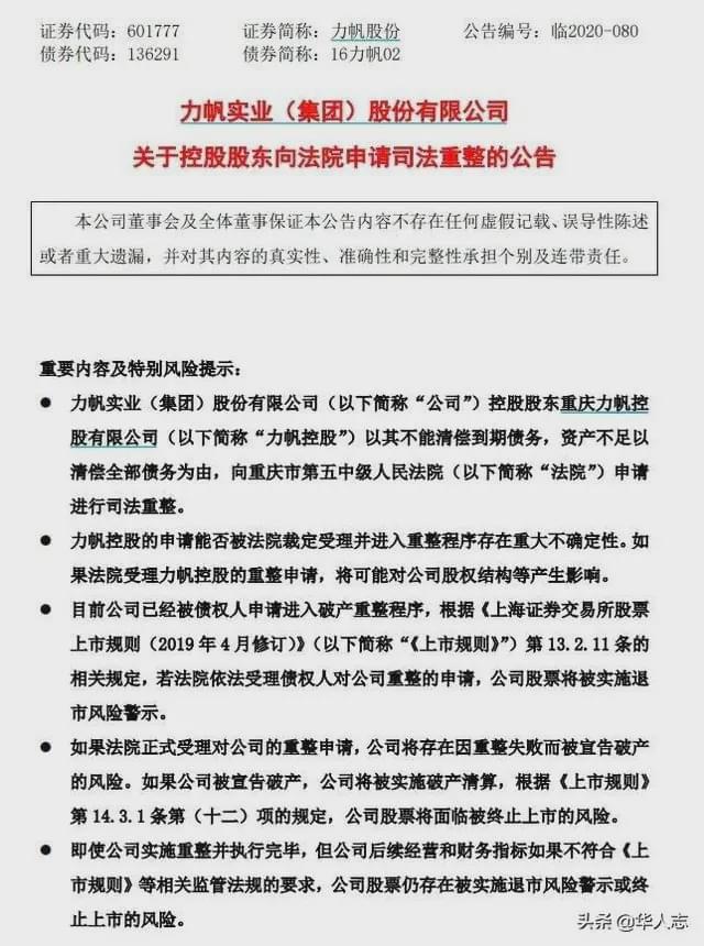 目前该公司已经被债权人申请进入破产重整程序,根据《上市规则》等相关规定,若法院依法受理债权人对力帆控股的重整申请,公司将存在因重整失败而被宣告破产的风险。如果公司被宣告破产,公司将被实施破产清算,其股票将面临被终止上市的风险。