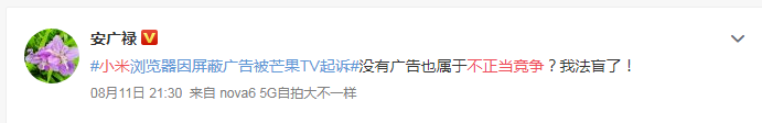 炣燃科技8月13日讯(宏斌)因为不正当竞争,小米再次成为被告。8月11日,小米浏览器因屏蔽广告遭芒果TV起诉。