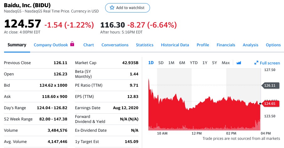 百度周四在纳斯达克交易所的开盘价为126.23美元。截至周四收盘,百度股价下跌1.54美元,报收于124.57美元,跌幅为1.22%。截至美国东部时间周四17:16分(北京时间周五5:16分),百度股价在盘后交易中下跌8.27美元至116.30美元,跌幅为6.64%。过去52周,百度股价最高为147.38美元,最低为82.00美元。