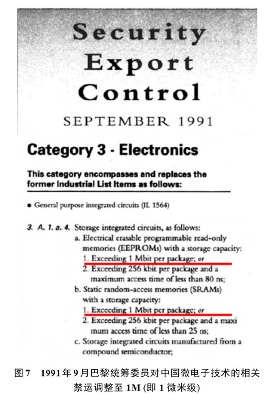 鉴于中国微电子技术已经达到微米级台阶,且完全能够独立生产1M位的只读存储器,1991年9月,巴黎统筹委员再次调整了对中国微电子技术的相关禁运,1M位的只读存储器和静态存储器全部对中国开放(图7)。至此,我国的微电子技术突破了1微米台阶,突破了西方国家对我国超大规模集成电路与的全方位封锁,开始向超大规模集成电路及其产业化的方向发展。
