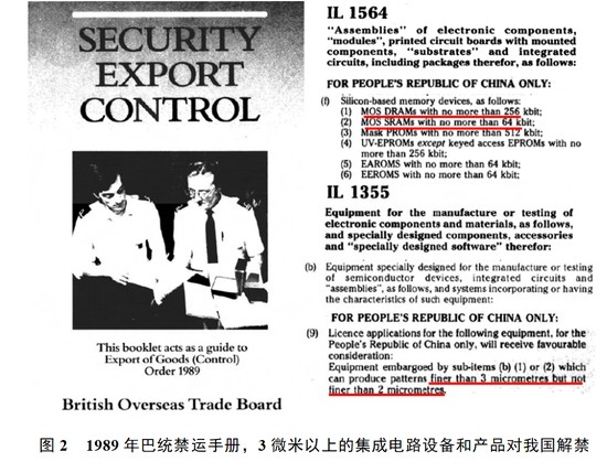 1989年的巴黎统筹委员会禁运手册上,对我国集成电路相关内容的禁运开始有了新的调整(见图2),在设备方面:3微米及以上的设备对我国解禁,但2微米以下的设备仍然是严格禁运的;在产品方面:动态随机存储器的容量开放到256K,静态随机存储器的容量开放到64K,相当于2微米水平。