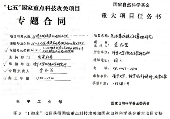 值得一提的是,1微米攻关过程并非仅仅由清华大学微电子所一家独自完成,这其中有着国内多家微电子研究机构和相关专家的协作。3微米研制过程中的测试软件,就是清华微电子所与中国科学院微电子中心合作开发出的,从而解决了一个重要难题。国家自然科学基金的重大任务更是由清华大学、中科院半导体所、北京大学三家单位共同承担(见图3)。为了研究方便,中国科学院半导体研究所的林兰英院士从国家经费里买了一台分子束外延就放在中科院微电子中心,大家共享使用。北京大学王阳元也曾回忆:“项目上有很多合作,我记得当初4K MOS DRAM,是北大设计的,在清华开发研制成功的”。