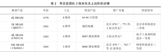 李志坚和团队研制成功的3微米典型产品是CM4016(2K×8 NMOS SRAM),这是一款16K静态MOS随机存储器。CM4016是国内首次研制成功的一种超大规模集成电路,它在28平方毫米的芯片上集成了十万八千个元件,采用了国际上比较典型的3微米工艺技术和计算机辅助设计技术,并且做成了2K×8位结构,使其可以广泛地用于微处理机和各种自动控制设备。经过清华大学计算机系的试用表明,CM4016完全可以取代进口的HM6116和TMS4016等产品,完全符合国际产品标准,达到了国际80年代初、国内领先的水平。与美国的同类产品TMS4016相比较,两个重要的技术指标,CM4016的地址取数时间小于150纳秒,工作功耗小于200毫瓦(美国的产品地址取数时间小于250纳秒,工作功耗小于300毫瓦),显然CM4016的主要指标要好于美国的同类产品。与CM4016配套,李志坚团队对标Intel8086微处理器,通过进行全面的技术剖析,结合具体的条件,同时研制成功了Cm8086高速H-MOS 16位微处理器,并且与中国科学院微电子中心合作,开发出了一套完整的测试软件,从而解决了研制16位微处理器的难题。经过鉴定,该Cm8086高速H-MOS 16位微处理器的性能达到了国外同类产品水平,并且能与它们互换使用,对我国16位微型机CPU的国产化提供了重要的技术基础。北京878厂、742厂等12家单位承接了CM4016和Cm8086的研究成果,开始了批量生产。1987年6月,“大规模和超大规模集成电路研制及3微米工艺开发” 获国家科技进步二等奖(李志坚排名第一)。