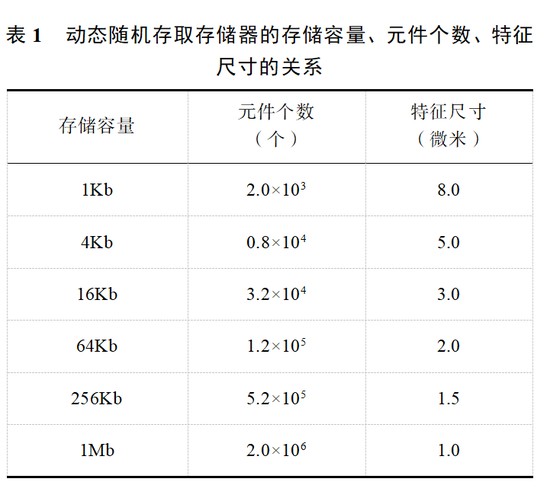 有些时候也可以用静态随机存取存储器(Static Random-Access Memory,SRAM)的容量来考察集成电路工艺及相应的生产线的技术水平,静态随机存取存储器上的一个数据存储单元通常需要4~6个晶体管,相同容量的产品,静态随机存取存储器的元件数就是动态随机存取存储器4~6倍。正因如此,与静态随机存取存储器相比,动态随机存取存储器拥有非常高的密度,单位体积的容量较高且成本较低。动态随机存取存储器的存储容量、元件个数和特征尺寸的基本关系参见表1。可见,64K容量的动态随机存取存储器,元件数已突破10万,特征尺寸达到了2微米,接近或达到了超大规模集成电路的水平。因此,要想研制、生产超大规模集成电路,必须要跨越微米级工艺台阶!