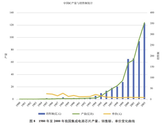 正因如此,集成电路一定要走向市场,形成产业,取得效益。集成电路产业需要资金、市场、技术、人才和政策五个方面的协同支持。而超大规模集成电路的研制成功和微米级工艺台阶的跨越在技术和人才两个方面都推动了我国集成电路的产业化。1995年11月,国务院提出“909工程”,其主要内容是:计划投资100亿,建设一条8英寸、0.5微米技术起步、月加工2万片的超大规模集成电路生产线,并且构造成产业链。1996年,“909工程”获得中央批准,上海华虹微电子有限公司成立。1997年,华虹微电子引进日本NEC的资金、管理和技术。1999年,华虹-NEC公司投产0.35微米,64M同步动态存储器(S-DRAM),达到了当时国际主流水准。由图8可见,20世纪90年代中期起,我国的微电子产业开始进入了快速发展时期,在产量突飞猛进的同时,销售额也开始迅速飞升;此外,90年代以后我国集成电路芯片的平均售价也开始逐渐下降。这些数据清晰地说明,90年代初期开始,我国的集成电路真正开始走向产业化和市场化之路,而这条道路的开端正是缘于超大规模集成电路的研制成功和微米级技术台阶的跨越。