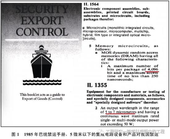 在存在巨大差距的同时,我国的微电子事业还面临着西方国家的全方位封锁。西方国家对我国微电子全方位封锁主要是通过巴黎统筹委员会(简称“巴统”)对中国相关技术、设备、产品的全面禁运实现的。巴黎统筹委员会是1949年11月在美国的提议下成立的,总部设在巴黎,其全称是“输出管制统筹委员会” (Coordinating Committee for Multilateral Export Controls) 。巴统的宗旨是执行对社会主义国家的禁运政策,其禁运产品包括军事武器装备、尖端技术产品和战略产品三大类。1952年,巴统成立了中国委员会,是专门针对中国实行禁运的执行机构。1985年的巴统禁运手册规定(见图1):生产或测试电子产品的设备中,5微米以下的光刻机对中国是严格禁运的(IL1355);电子产品和相关技术中,4K容量DRAM(特征尺寸5微米)的相关产品和技术对中国是严格保密和禁运的(IL1564)。