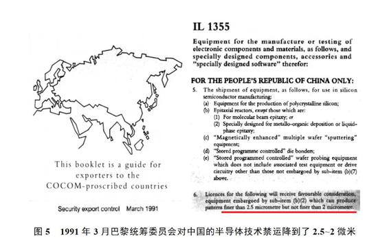 1兆位超大规模集成电路汉字只读存储器及其试验工艺线的研制成功,宣告我国首次跨上了1.5微米工艺和百万个元器件集成度的技术台阶,是我国超大规模集成电路技术的一次突破性进展。伴随着我国在超大规模集成电路研制上的突破,1991年3月,巴黎统筹委员会对我国的半导技术和设备的禁运也降到了2.5~2微米(图5)。